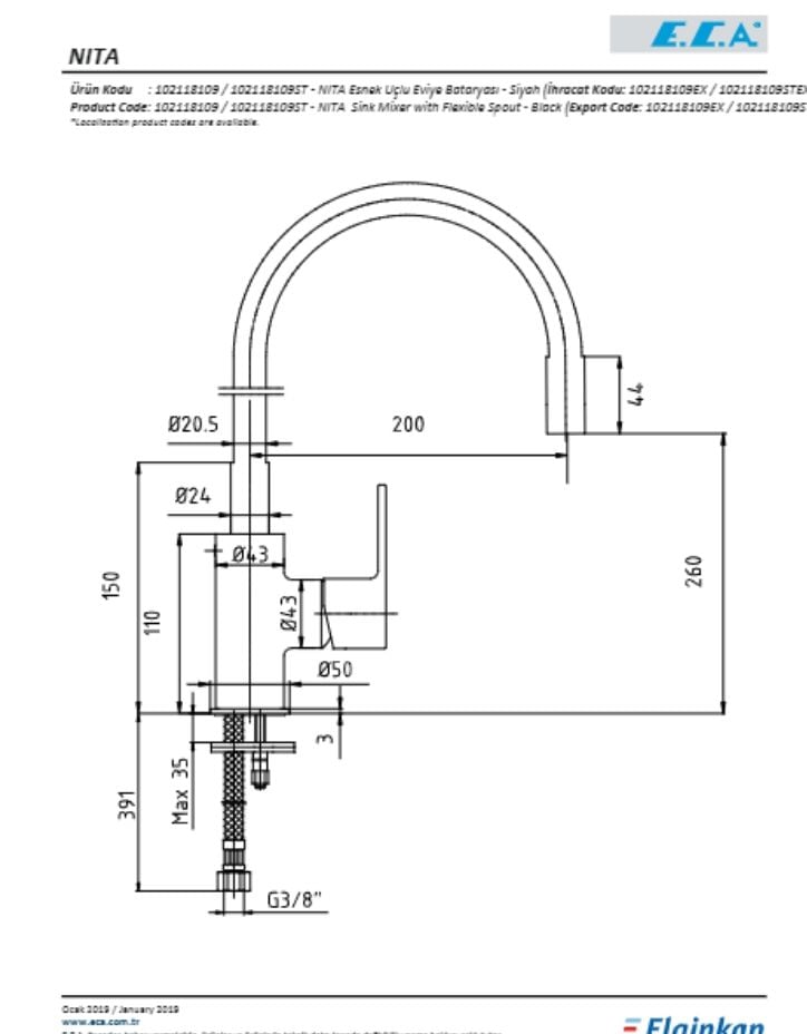 ECA Nita Esnek Çıkış Uçlu Eviye Bataryası – Siyah, mutfak kullanımı için ideal bir seçenektir. Çıkış ucu uzunluğu ve yüksekliği ayarlanabilir esnek yapıya sahiptir, bu sayede kullanım kolaylığı sağlar. Şık siyah rengiyle de dekorasyonunuza uyum sağlar.